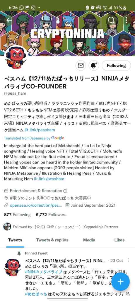 Pessham can be said to be in charge of the hard part of Metabacchi / La La La Ninja songwriting / Healing voice NFT / Total VT2.6ETH / Mofumofu NFM is sold out for the first minute / Fraud is encountered / Healing voices can be heard in the holder limited community / Michizo Miki also appears [2093 people visited] Hosted by NINJA Metabarive / Illustration & Healing Pess / Music & Marketing Ham,